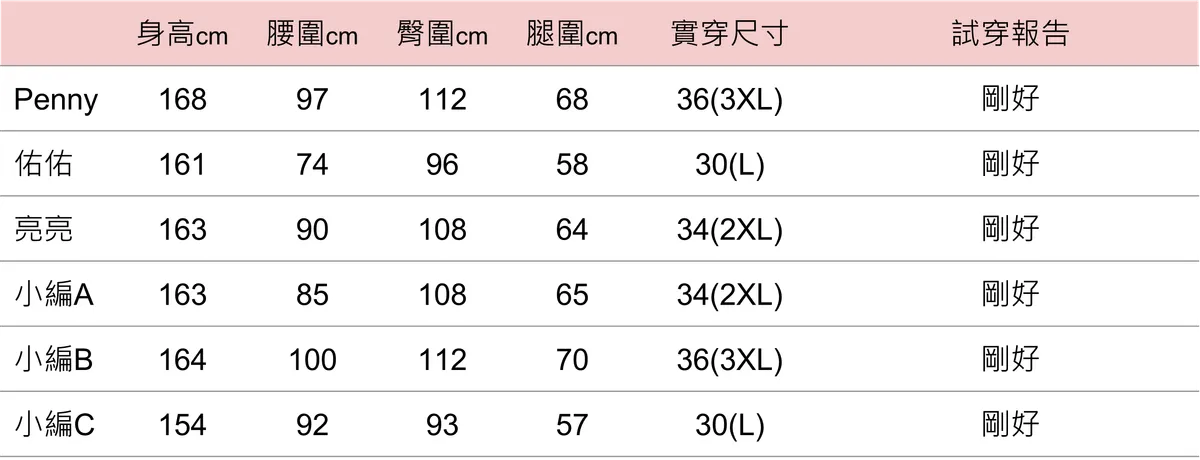 | 尺寸(cm) | 腰圍 | 臀圍 | 大腿圍 | 褲管圍 | 前褲襠 | 總長 |