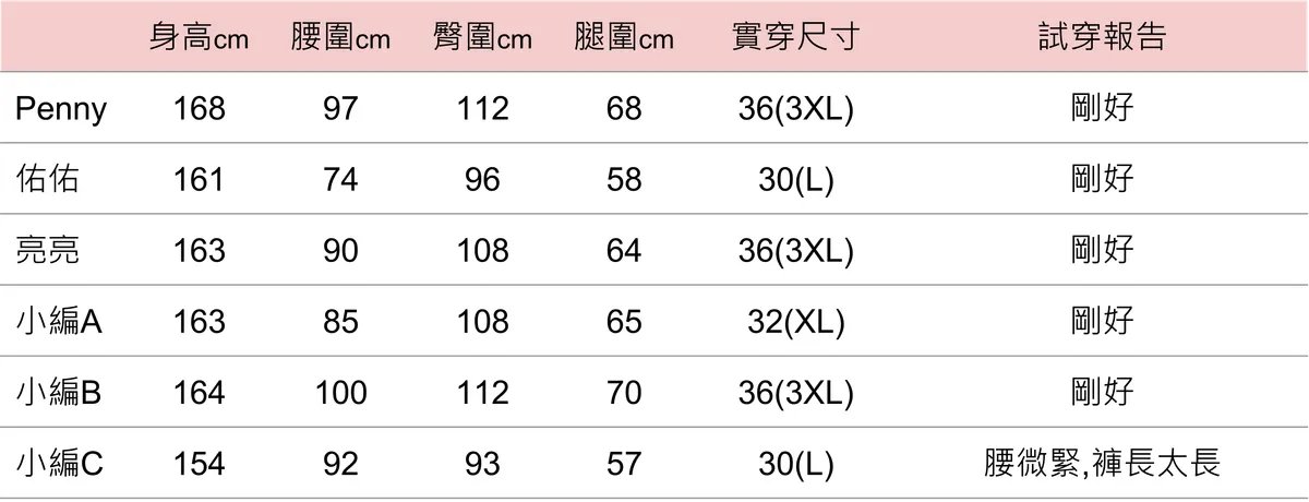 | 尺寸(cm) | 腰圍 | 臀圍 | 大腿圍 | 褲管圍 | 前褲襠 | 後褲襠 | 總長 |
