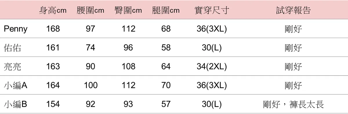 | 尺寸(cm) | 腰圍 | 臀圍 | 大腿圍 | 褲管圍 | 前褲襠 | 後褲襠 | 總長 |
