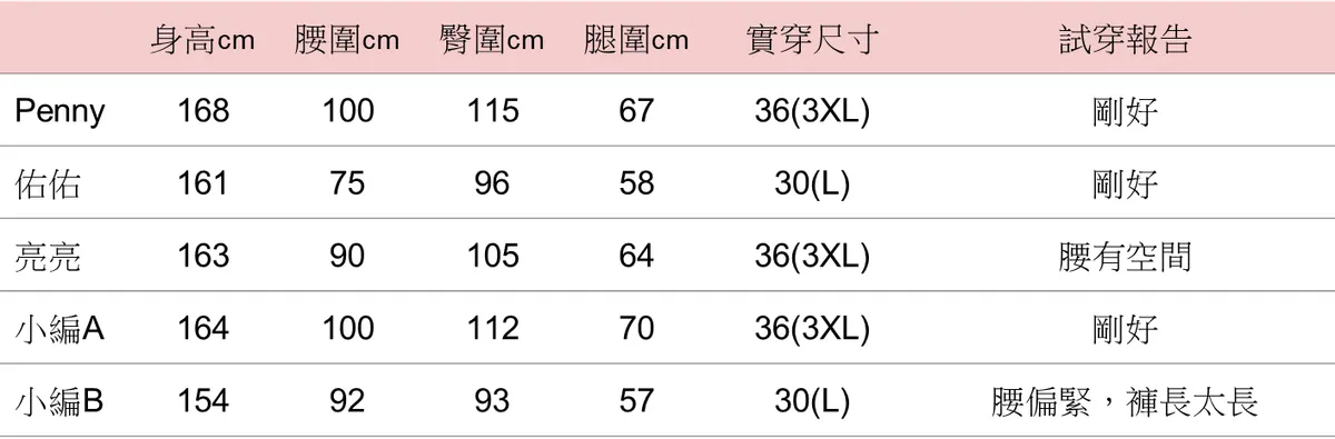 | 尺寸(cm) | 腰圍 | 臀圍 | 大腿圍 | 褲管圍 | 前褲襠 | 後褲檔 | 總長 |