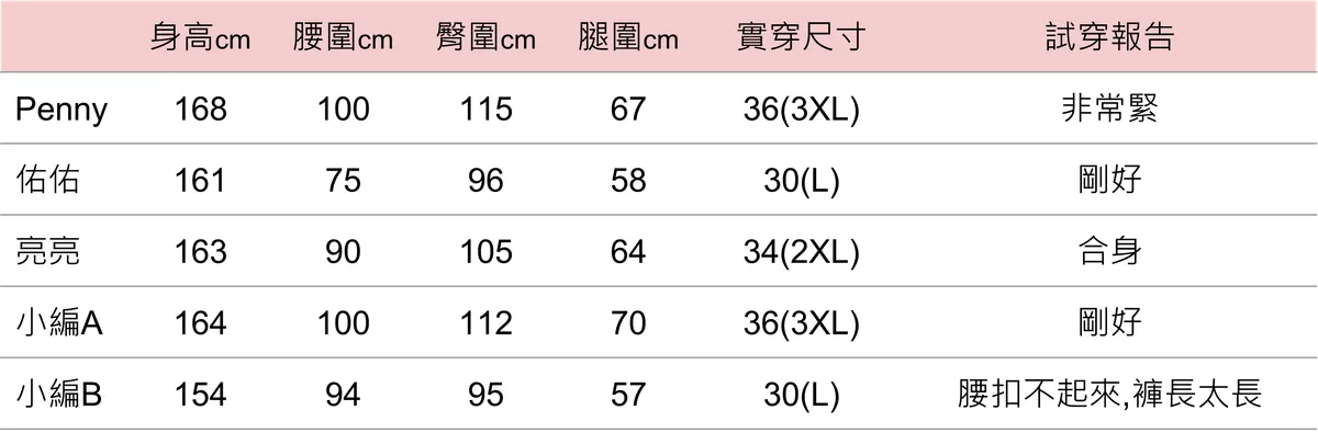 | 尺寸(cm) | 腰圍 | 臀圍 | 大腿圍 | 褲管圍 | 前褲襠 | 後褲襠 | 總長 |