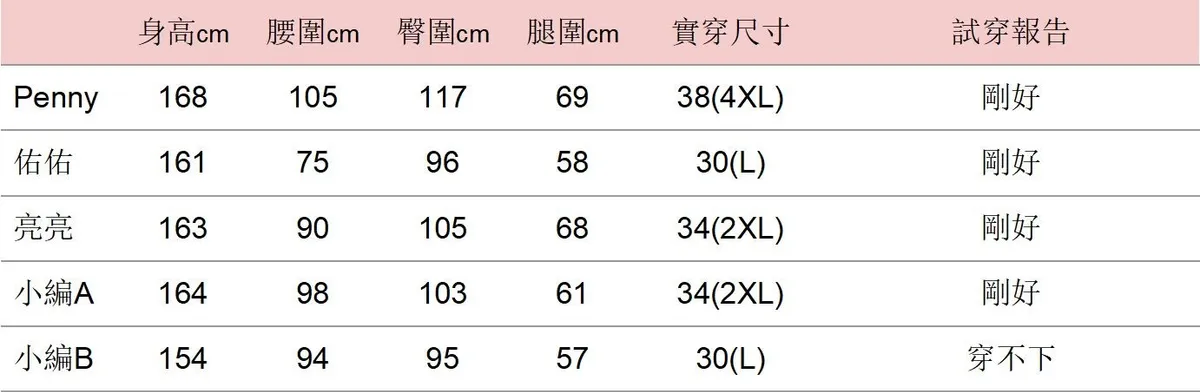 | 尺寸(cm) | 腰圍 | 臀圍 | 大腿圍 | 褲管圍 | 前褲襠 | 後褲襠 | 總長 |