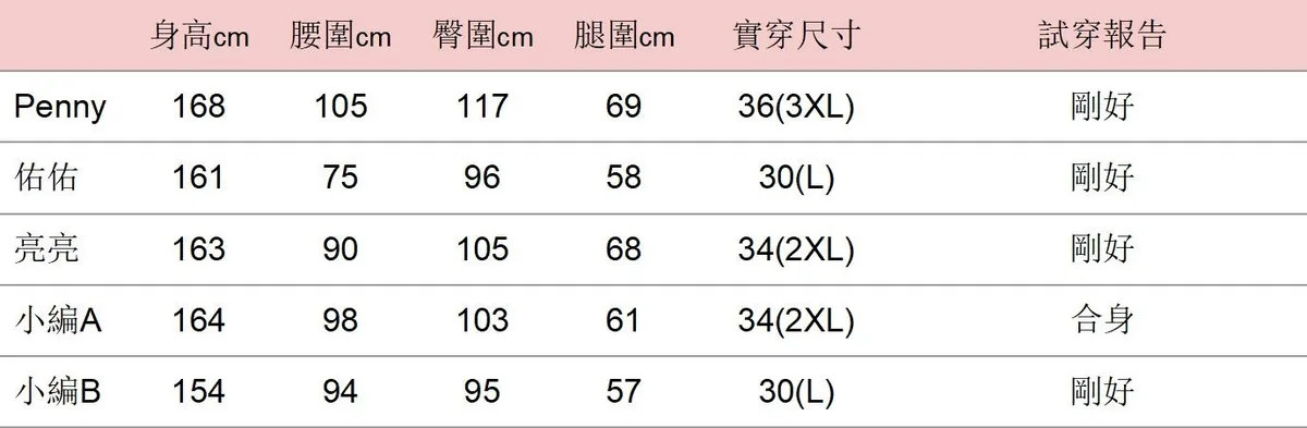| 尺寸(cm) | 腰圍 | 臀圍 | 大腿圍 | 褲管圍 | 後褲襠 | 總長 |