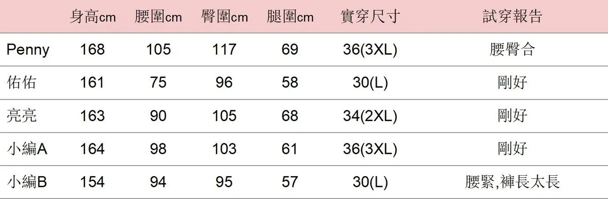 | 尺寸(cm) | 腰圍 | 臀圍 | 大腿圍 | 褲管圍 | 前褲襠 | 總長 |