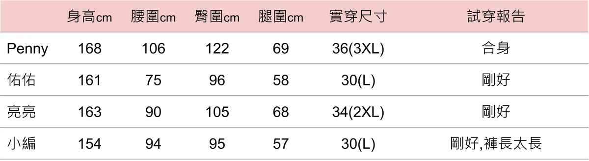 尺寸(cm) 腰圍 臀圍 大腿圍 褲管圍 前褲襠 總長