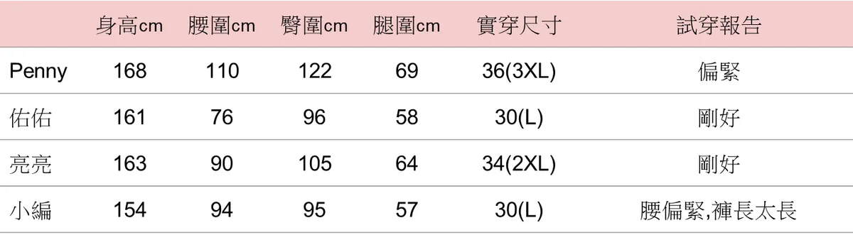 尺寸(cm) 腰圍 臀圍 大腿圍 褲管圍 前褲襠 後褲襠 總長